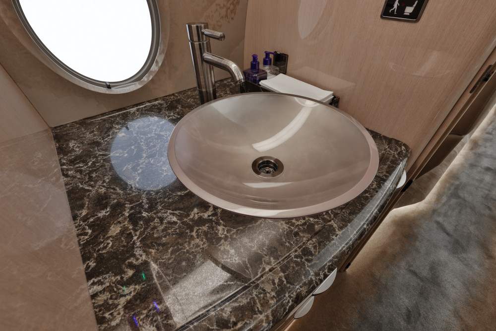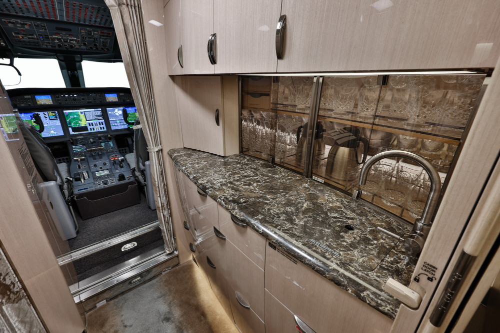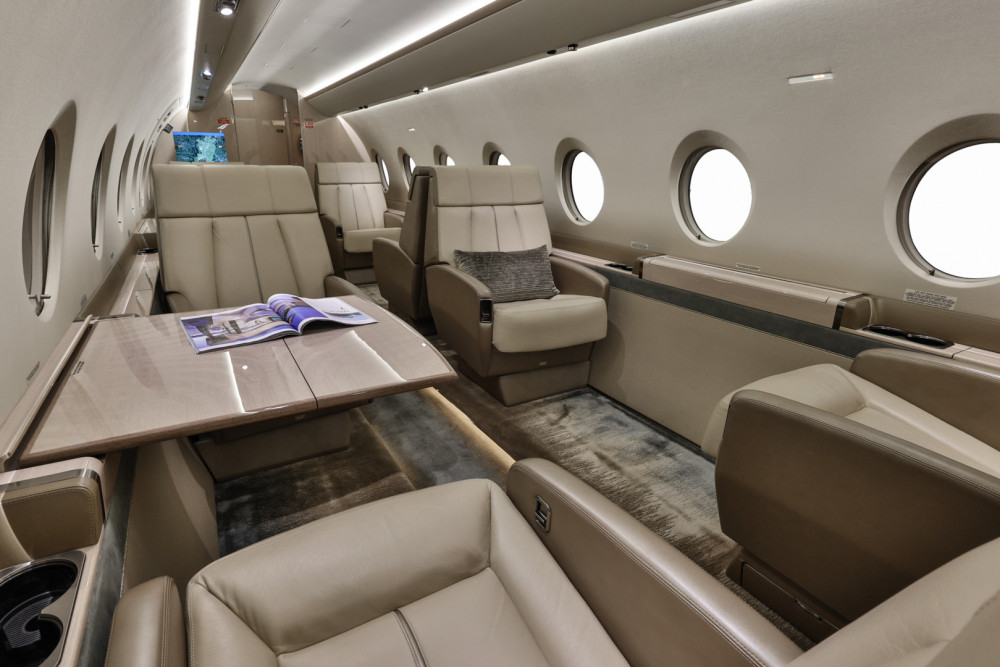 The cabin is arranged to support both productivity and rest, with a flat floor, Gulfstream-style interior fit and finish, and a layout that usually includes a forward galley and enclosed aft lavatory. Most aircraft provide a combination of club seating and additional chairs opposite or aft, plus substantial baggage volume suited to longer trips.