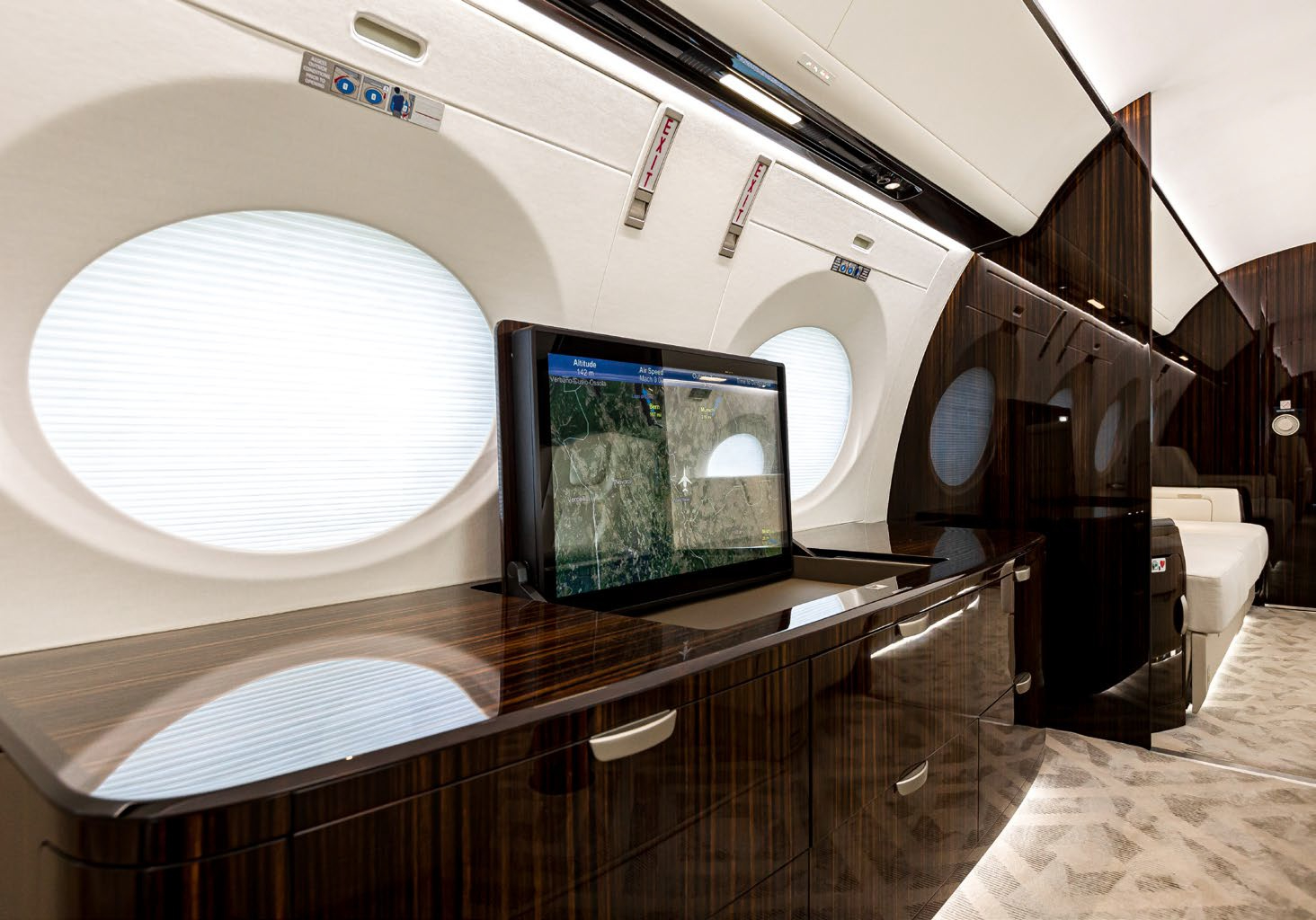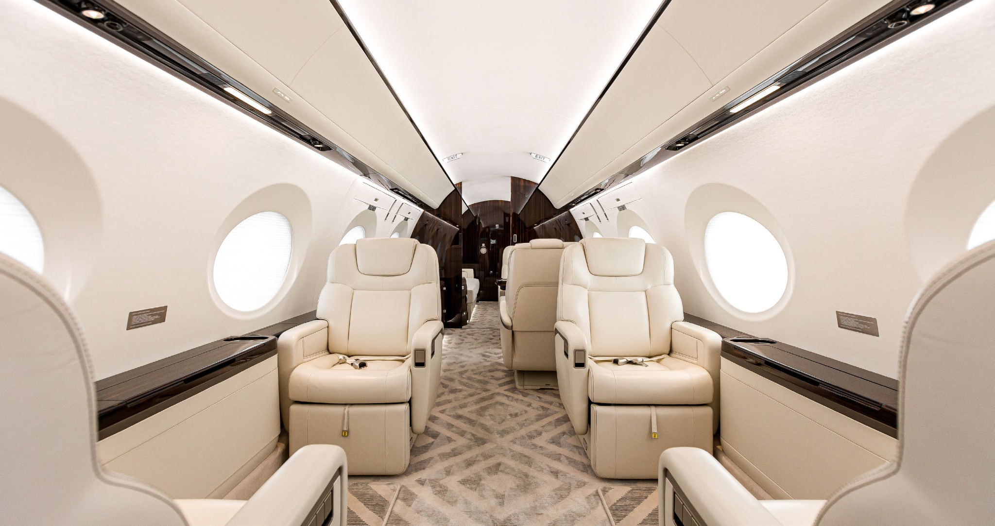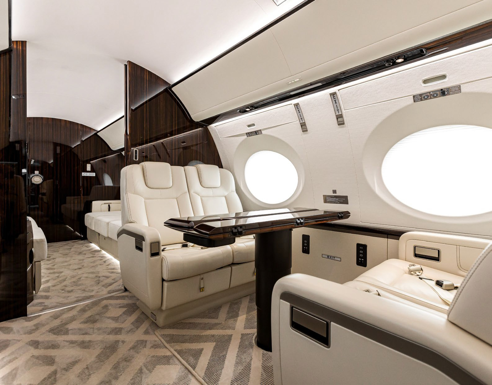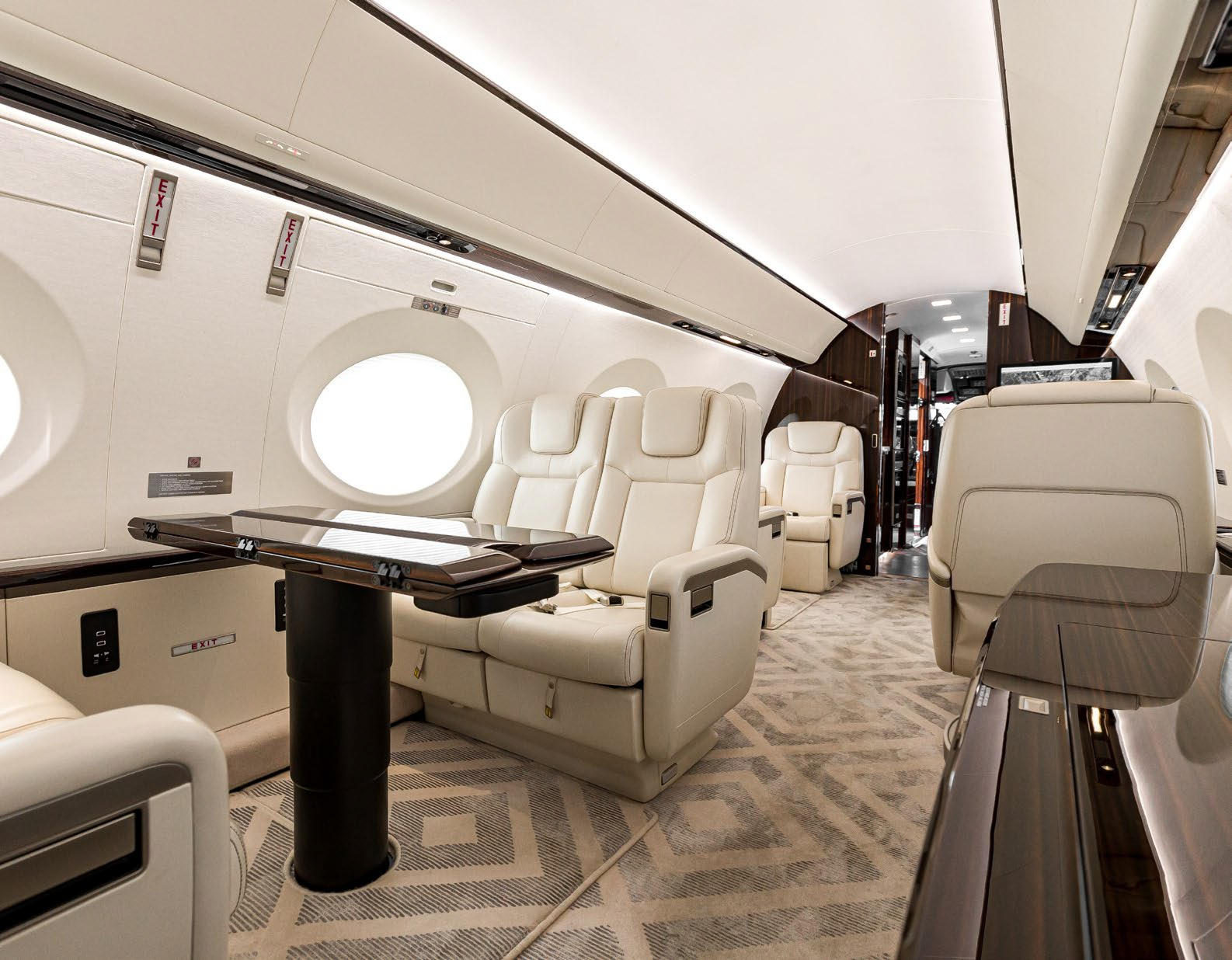 The cabin is arranged to support long missions: a stand-up class cross-section, multiple living zones, and a galley/entry area that can sustain full-service catering. Typical interiors emphasize low fatigue on extended flights through pressurization and sound management (exact values vary by build), with connectivity and power provisions commonly specified for work-focused trips. Baggage access and lavatory fit depend on the specific completion.