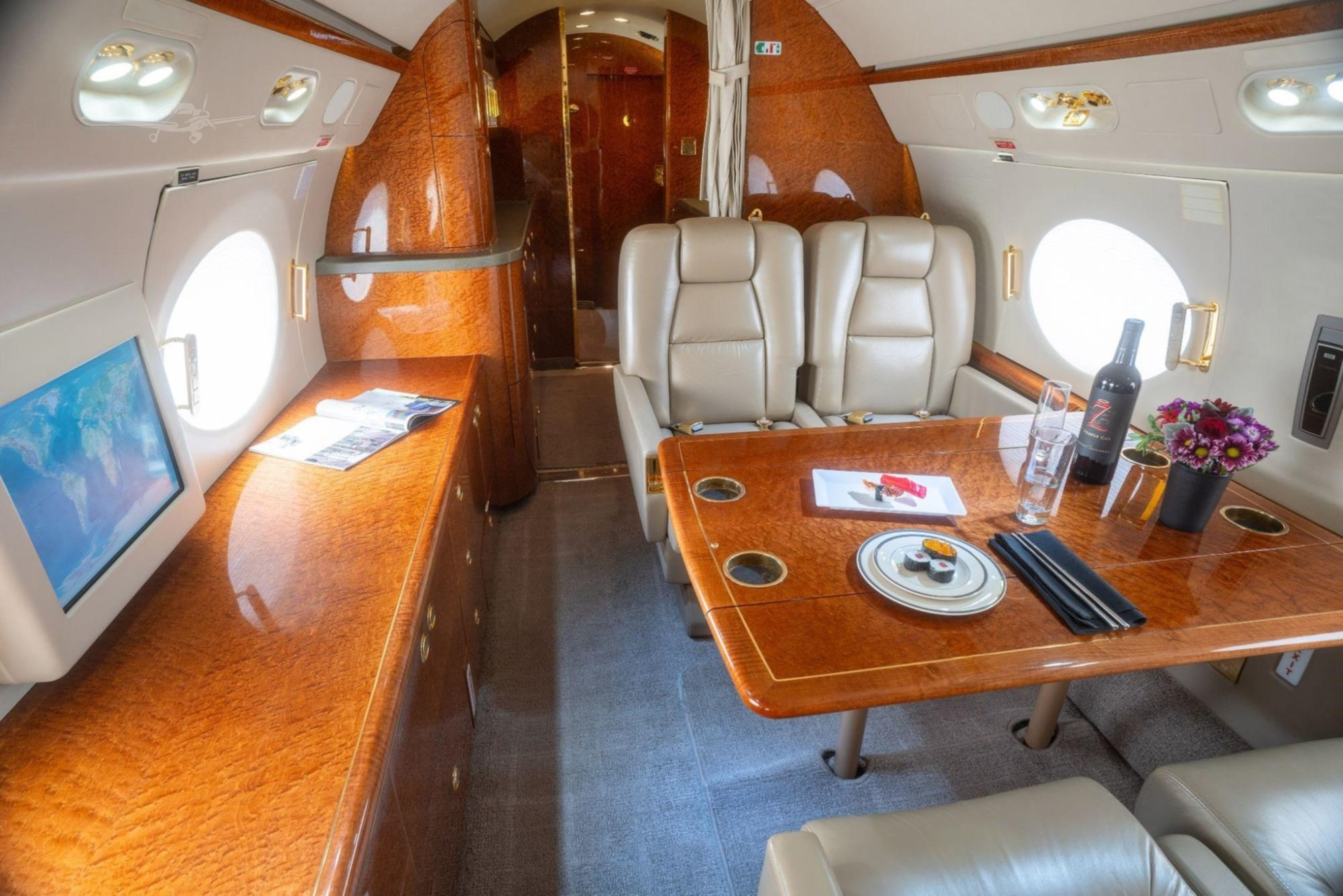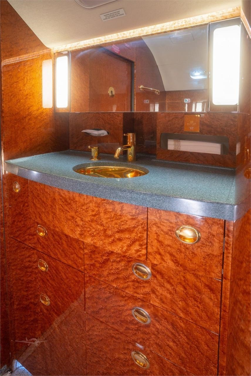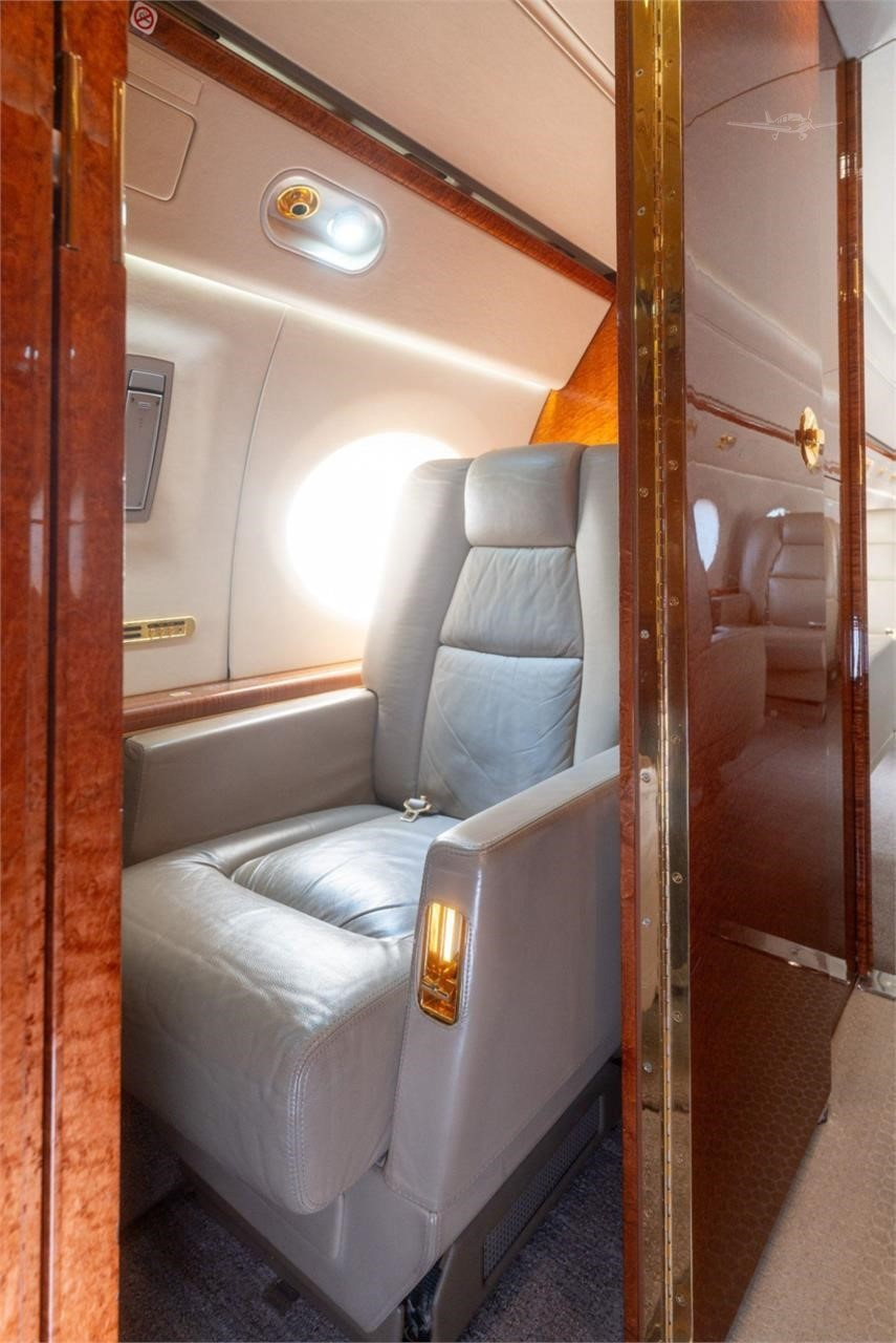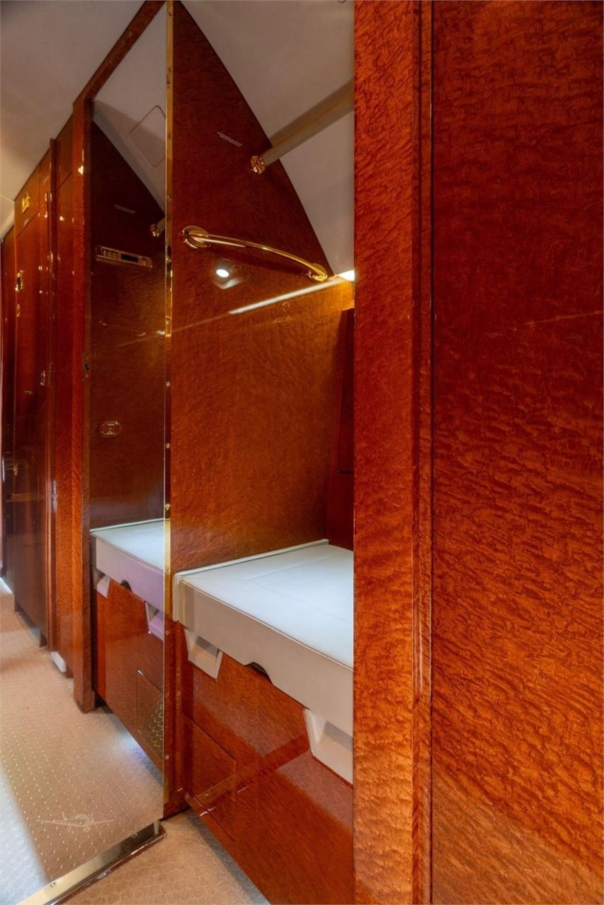 - Additional Features: Crew rest area, jumpseat, Airshow 4000 entertainment system, multiple monitors including 19-inch bulkhead HD monitors