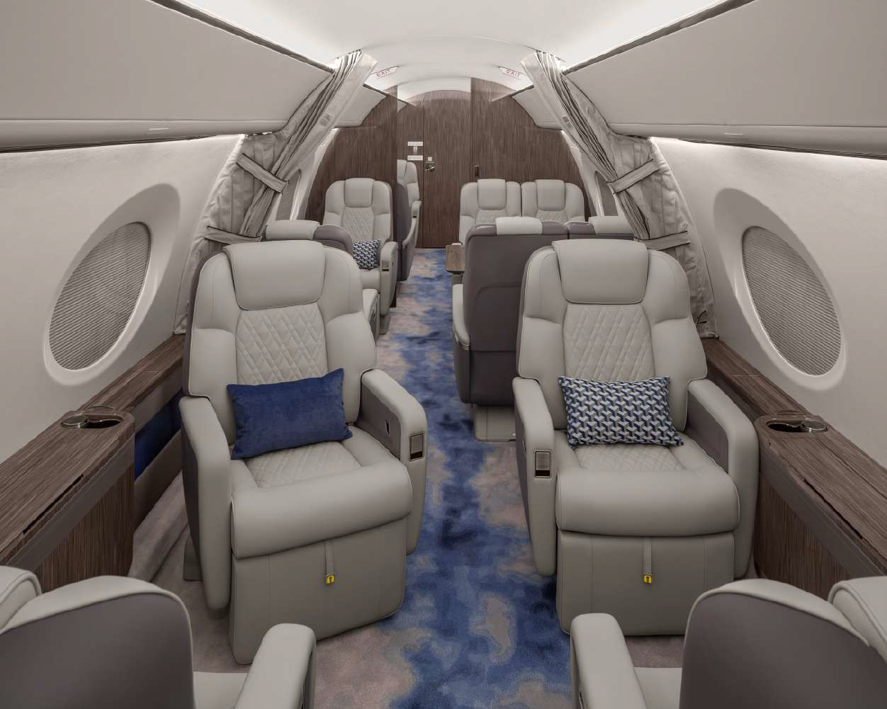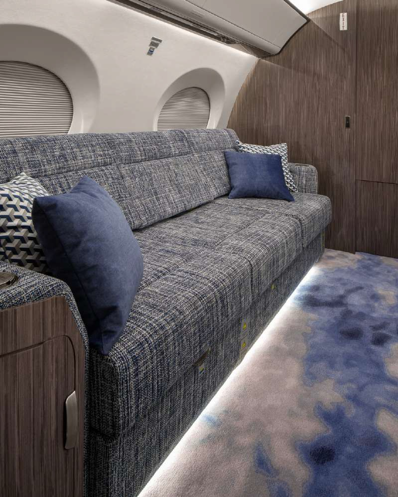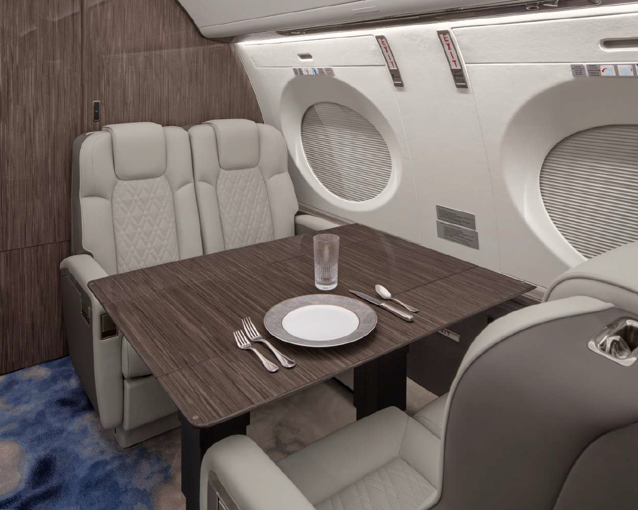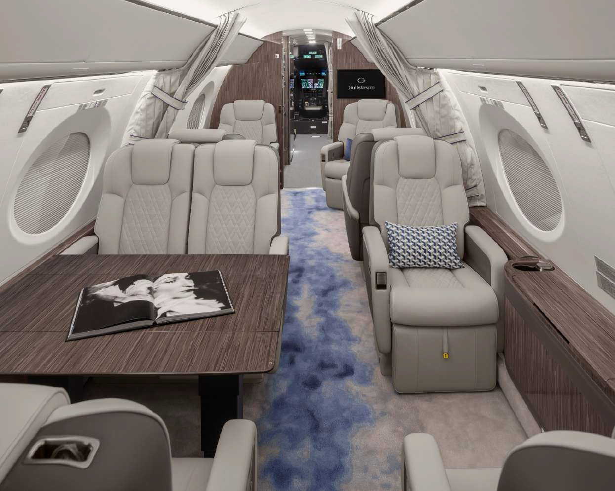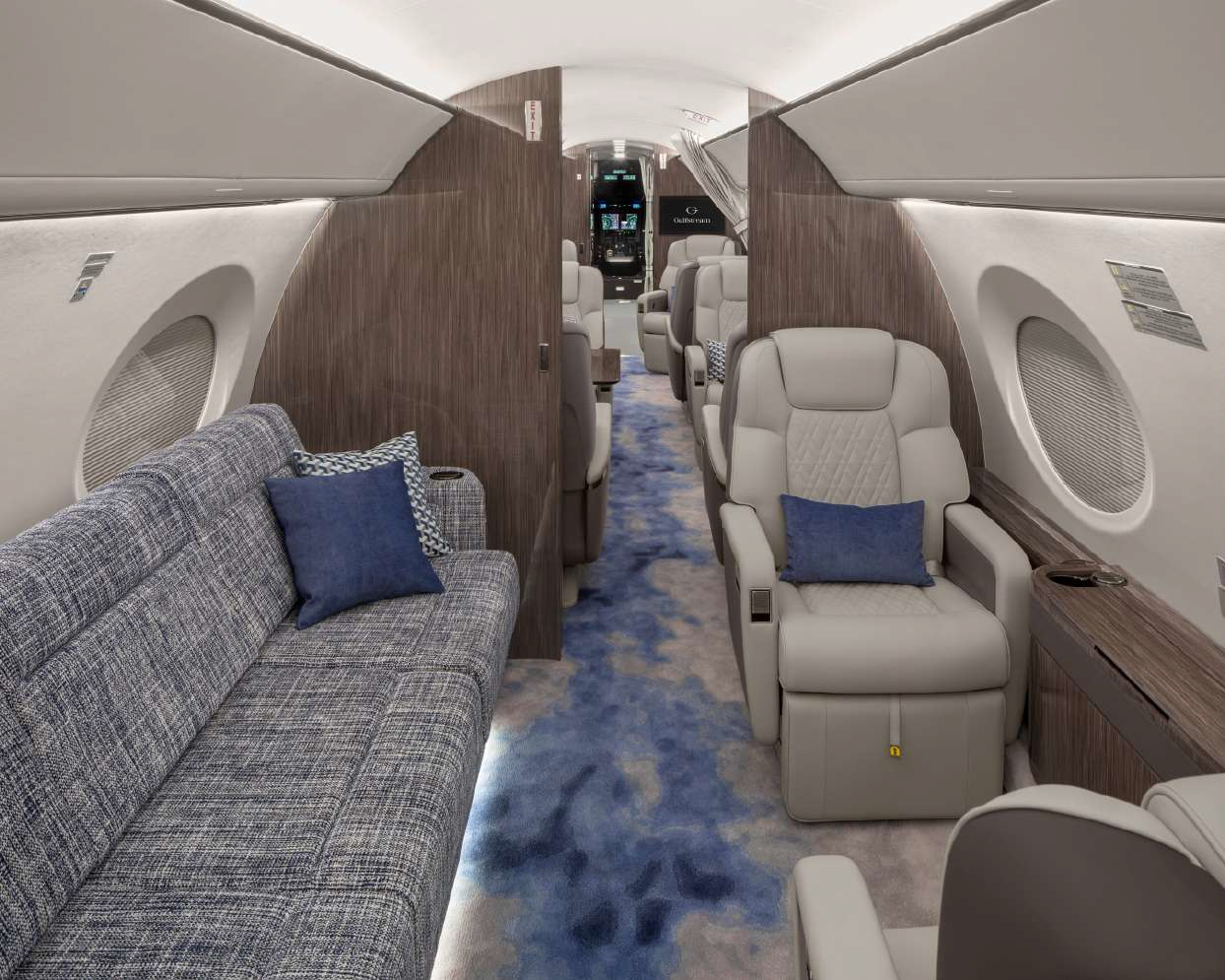 The cabin is designed around a wide-body cross-section with multiple living zones, typically combining club seating, conference/dining options, and an aft rest/lavatory area depending on configuration. Gulfstream’s cabin philosophy emphasizes a low cabin altitude at cruise, large windows, and strong environmental control performance to support comfort on long flights. Noise levels and ride quality are typically aligned with the expectations of the large-cabin segment, especially at high altitude.