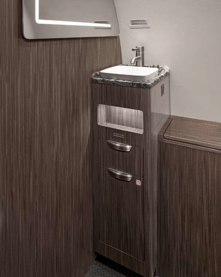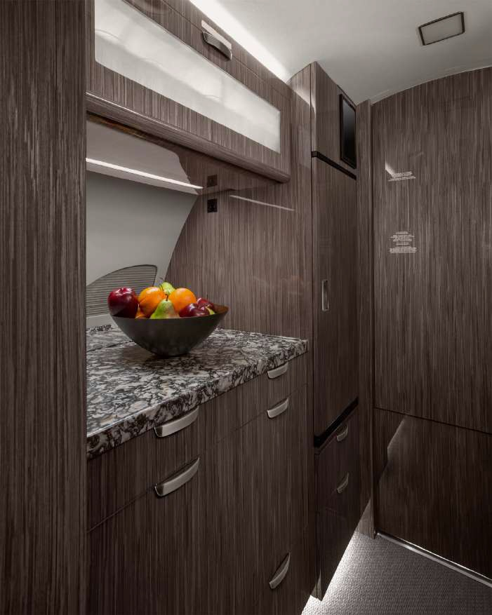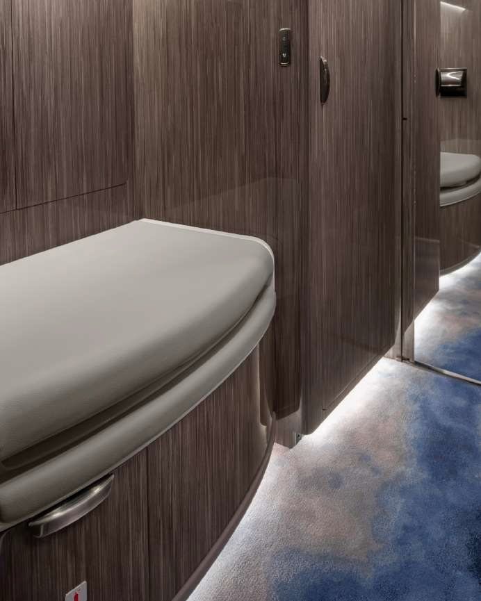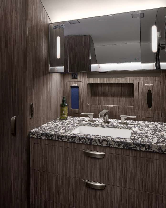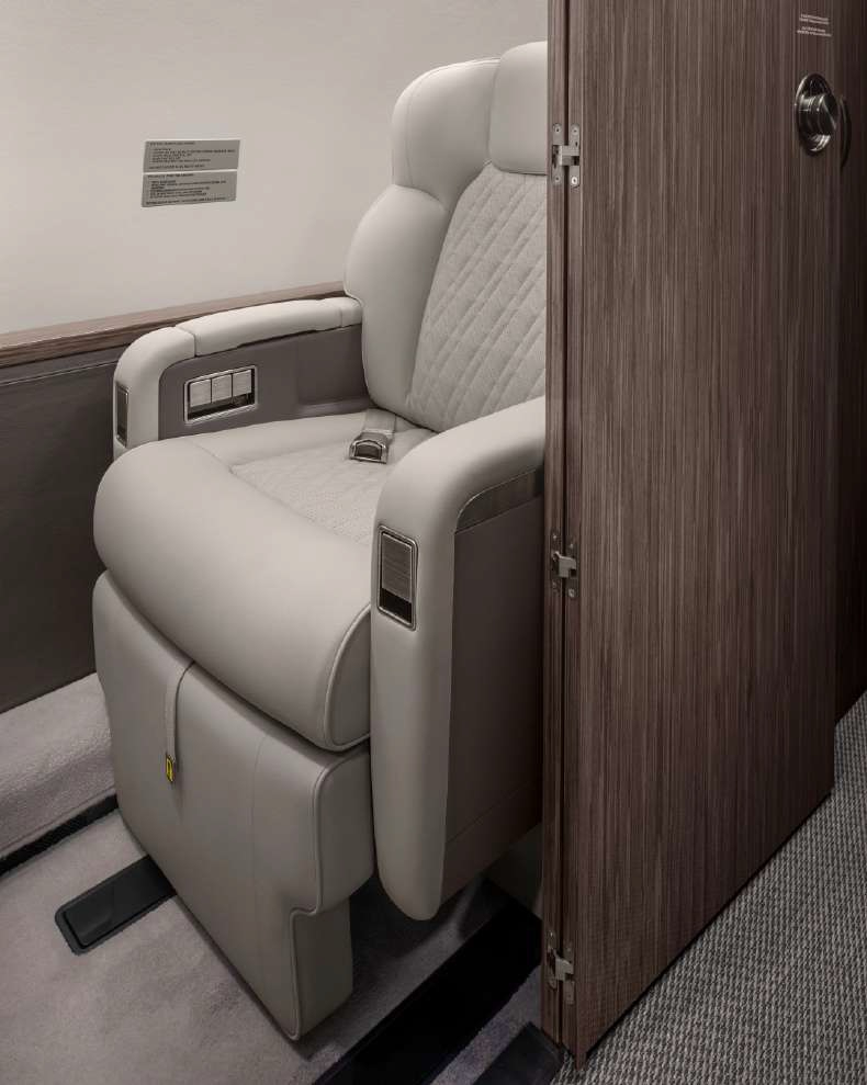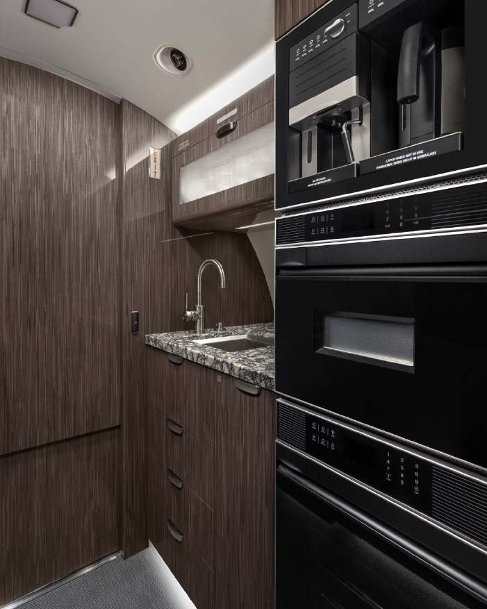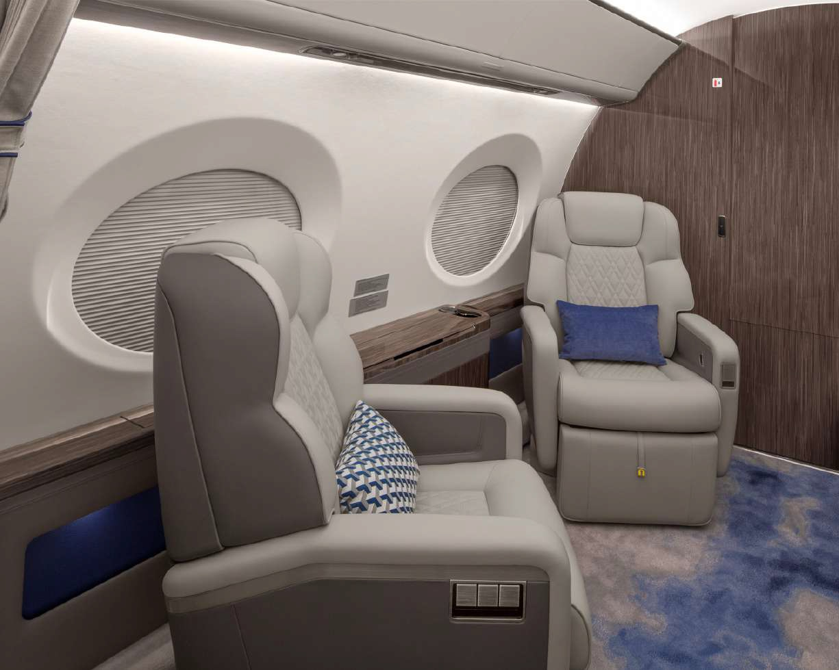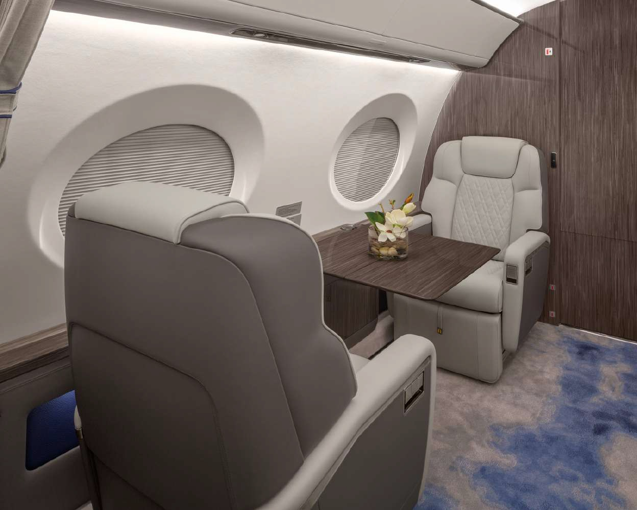 The cabin is designed around a wide-body cross-section with multiple living zones, typically combining club seating, conference/dining options, and an aft rest/lavatory area depending on configuration. Gulfstream’s cabin philosophy emphasizes a low cabin altitude at cruise, large windows, and strong environmental control performance to support comfort on long flights. Noise levels and ride quality are typically aligned with the expectations of the large-cabin segment, especially at high altitude.