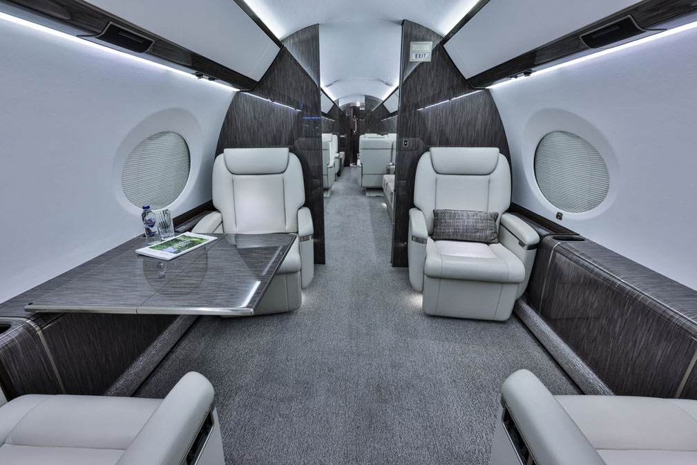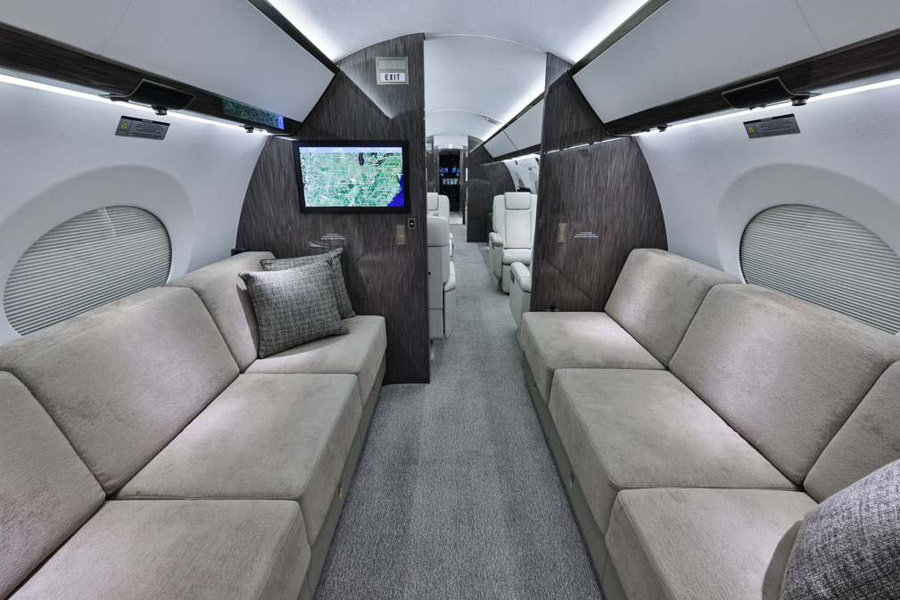 The cabin is configured for long-duration comfort with a tall cross-section, wide aisle, and multiple living zones to separate meetings, dining, and rest. Large oval windows and higher typical cruise altitudes support a brighter, less fatiguing environment for passengers. Most aircraft are delivered with an enclosed aft lavatory and a forward galley sized for international catering, with seating layouts that emphasize lie-flat sleeping options for a portion of the cabin.