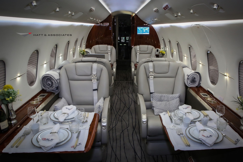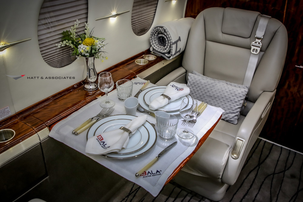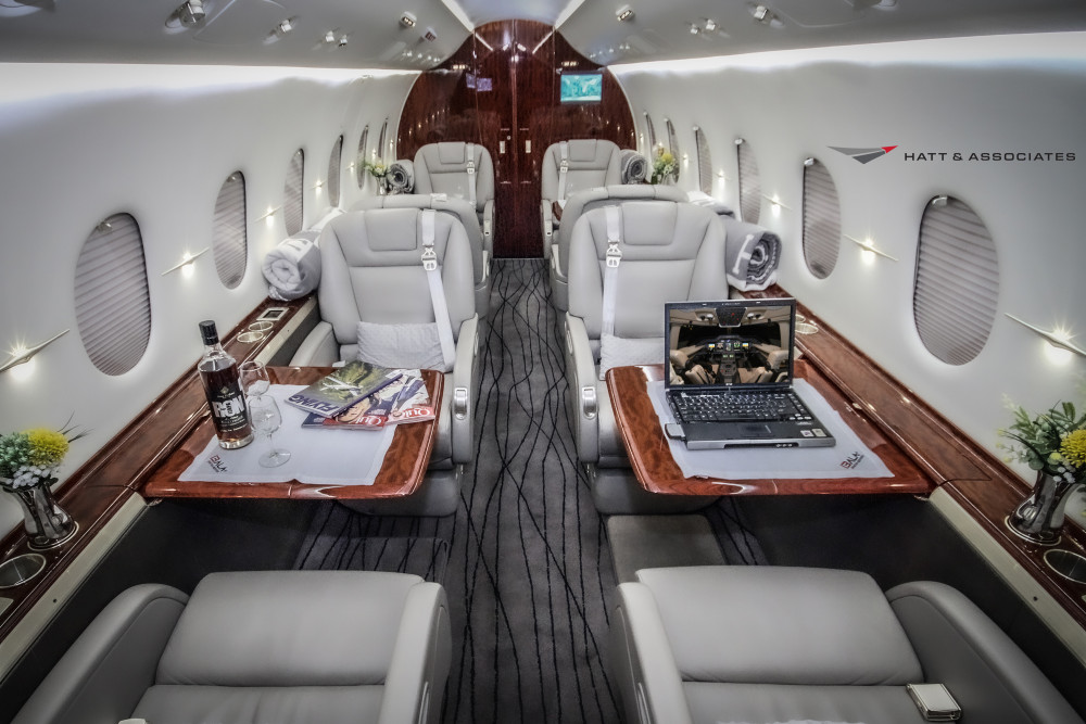 - Cabin: Configured for nine passengers with a four-place club seating arrangement and fold-out card tables; features two 15" LCD monitors for entertainment.