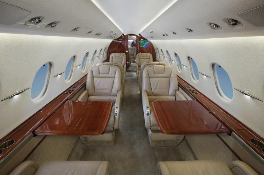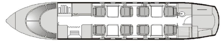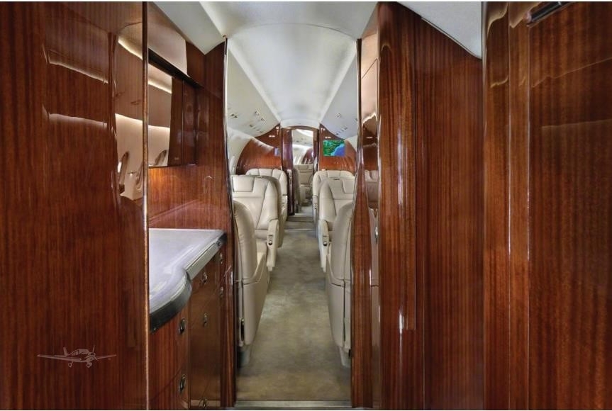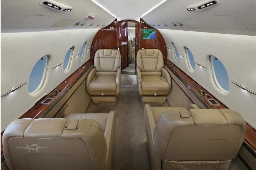 - Interior: Executive configuration for 8 passengers, flat floor design, tan leather berthable seating, matching fabric sidewalls, tan carpet, forward galley, mahogany high-gloss cabinetry, Airshow 4000 entertainment system, Gogo Biz broadband internet & Wi-Fi, LED cabin lighting, sleeps 4, externally-serviceable belted aft lav.