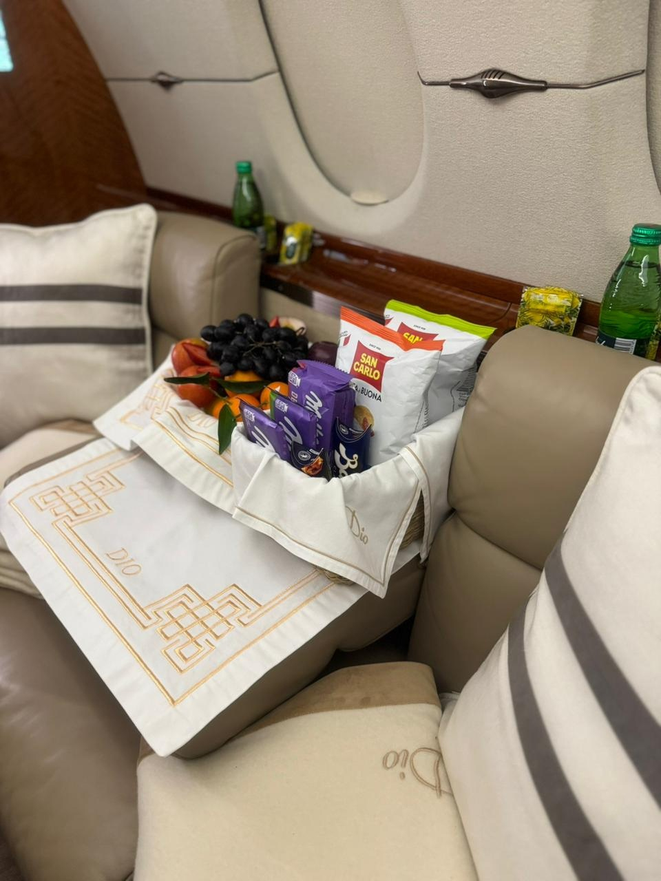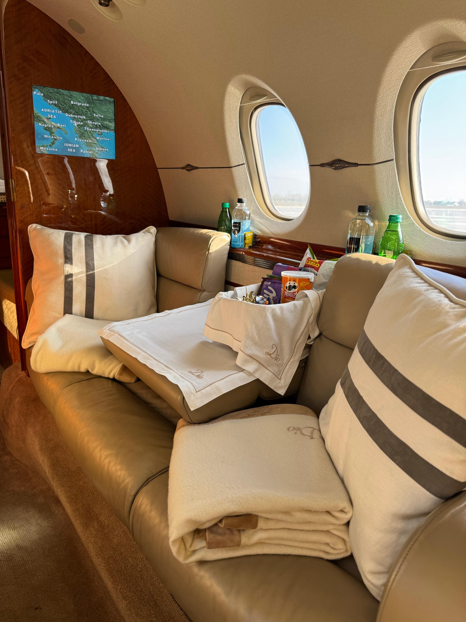 - Beige leather seating, sheepskin-covered crew seats