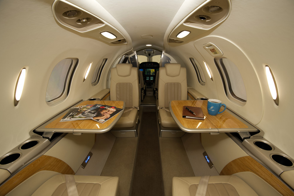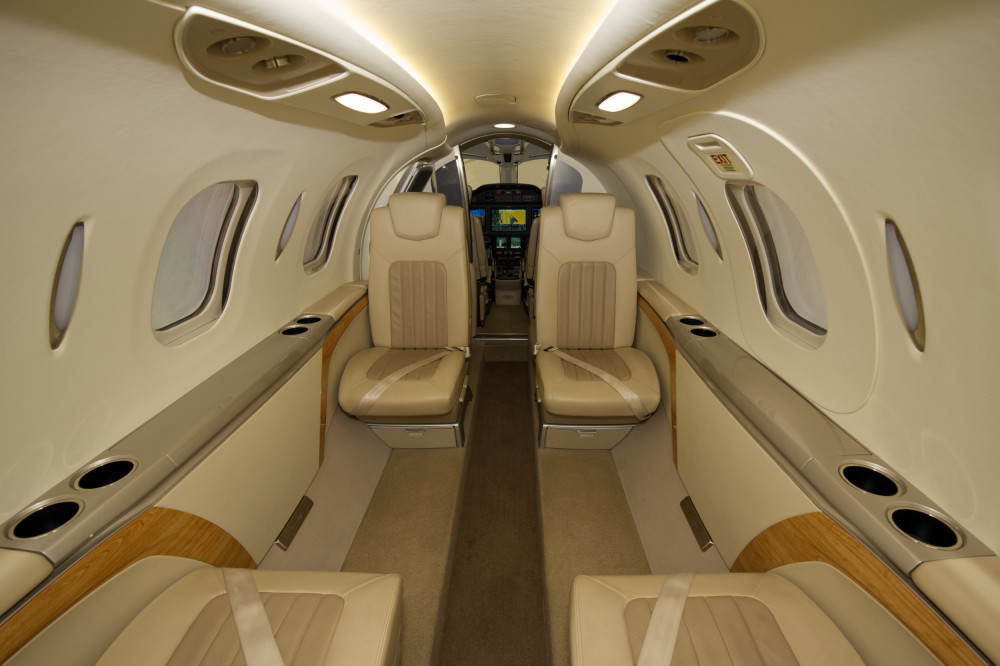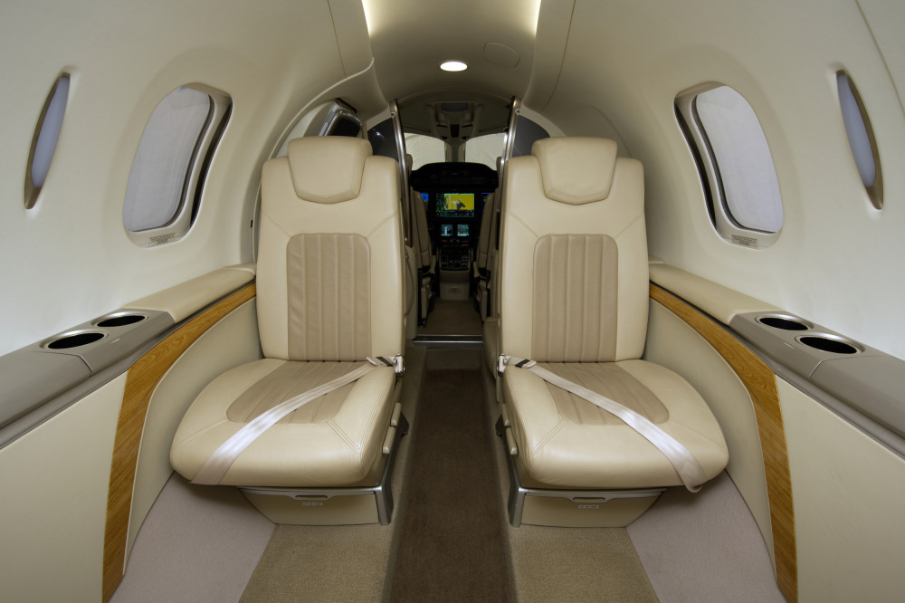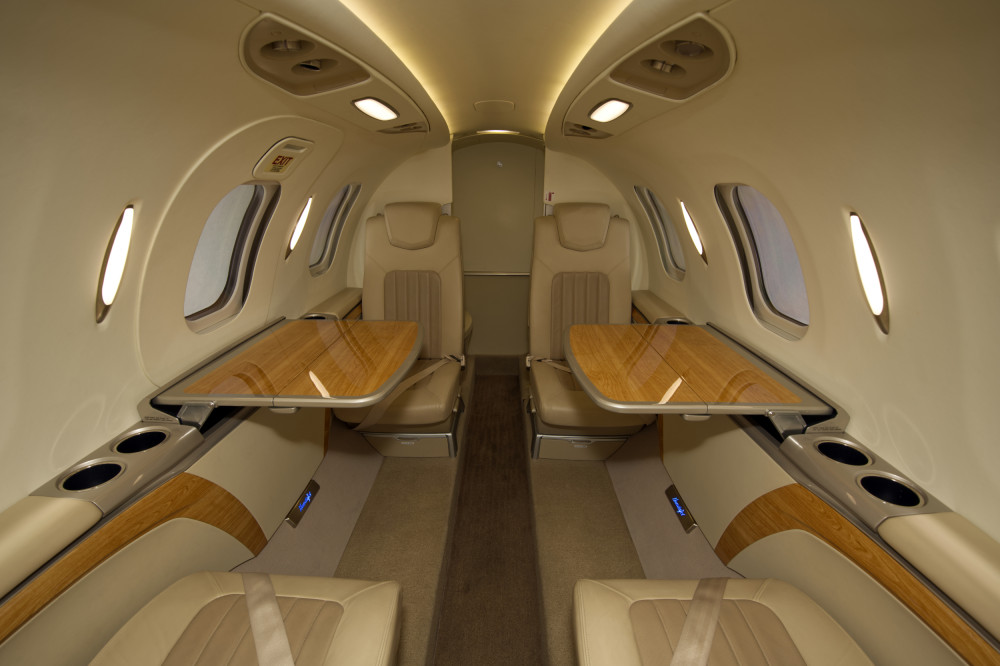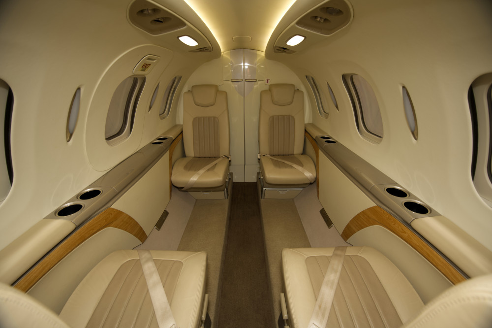 - Interior: Executive configuration for 6 passengers; upgraded dual-tone seating; private externally-serviceable belted aft lavatory; parchment interior with soft beige and light tan accents; birch carpeting; Pacific maplewood trim; enhanced cabin management system.