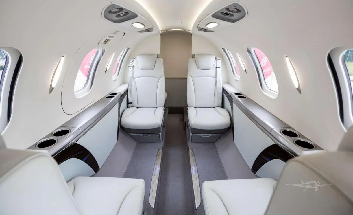 - Interior: Executive configuration for 5 passengers, moonlight interior color palette, executive seat upgrade, ice silver Glacier carpeting with eucalyptus trim, enhanced cabin management system, electric pleated window shades, and solid aft cabin door.