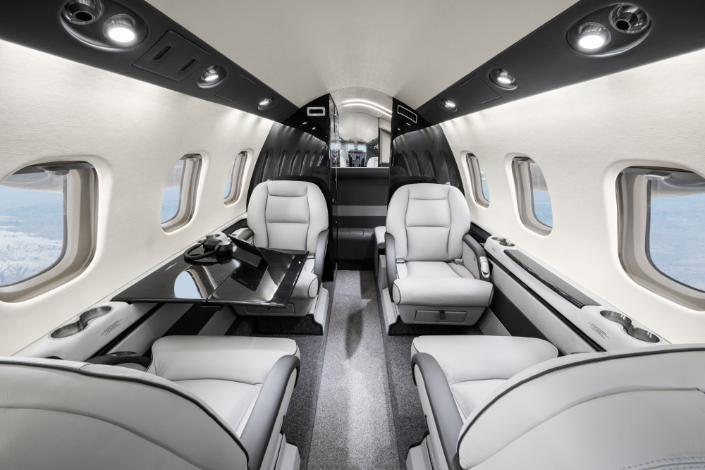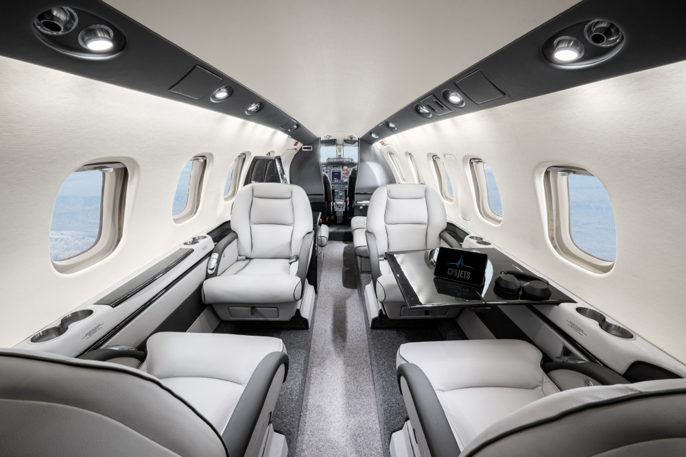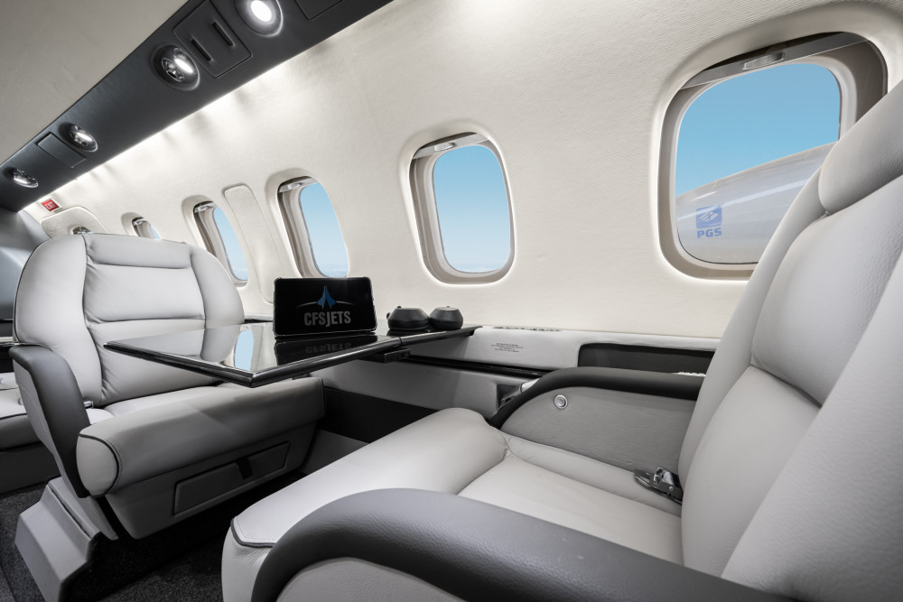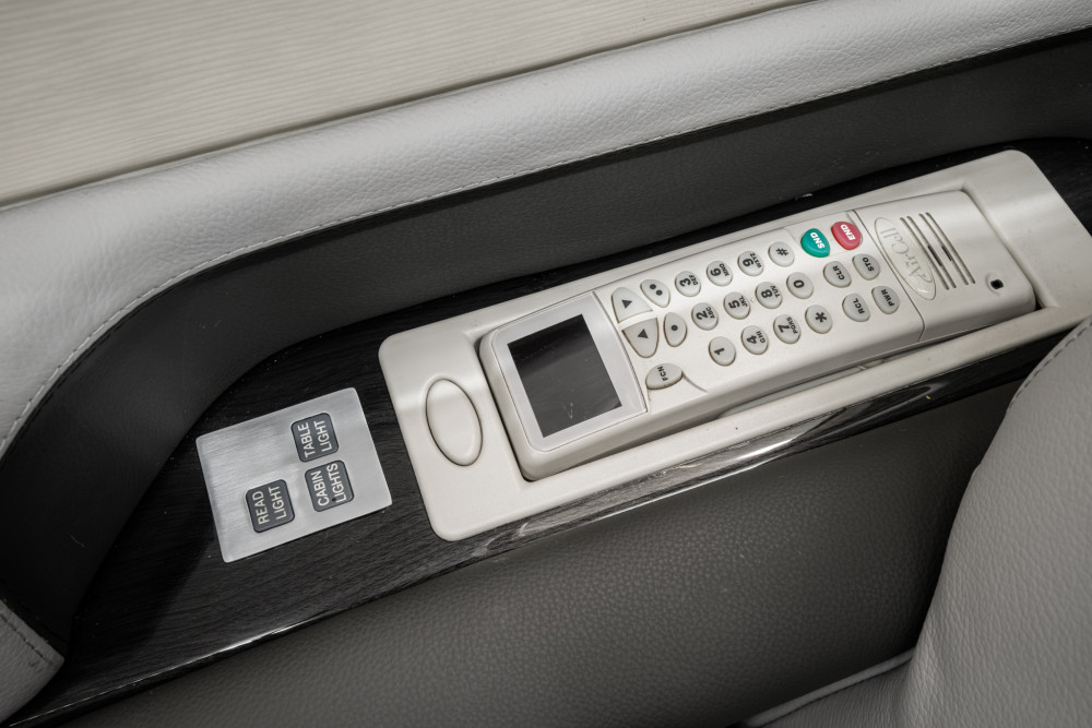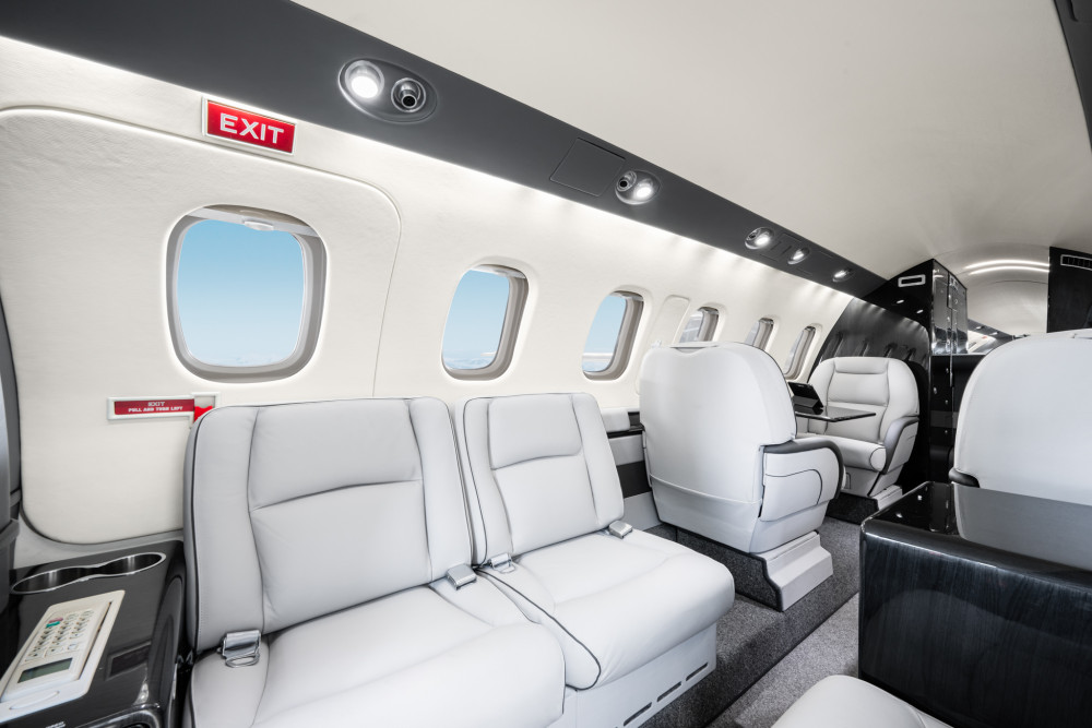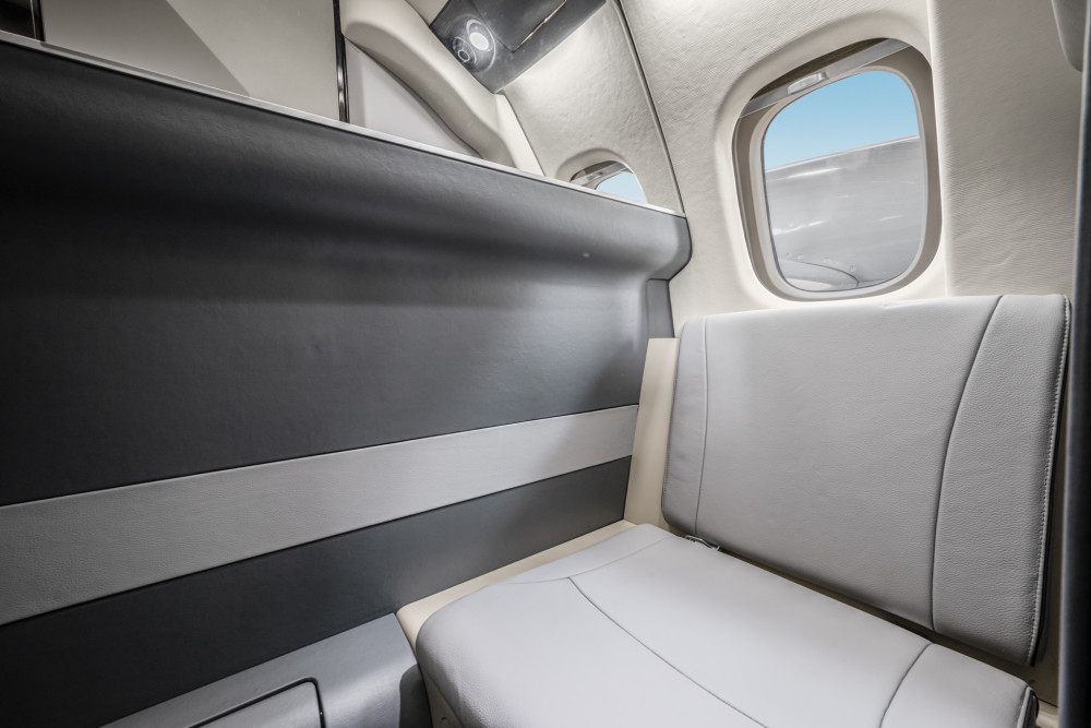 - Interior: Executive configuration for 8 passengers, light gray leather, LED lighting, fully enclosed belted lavatory