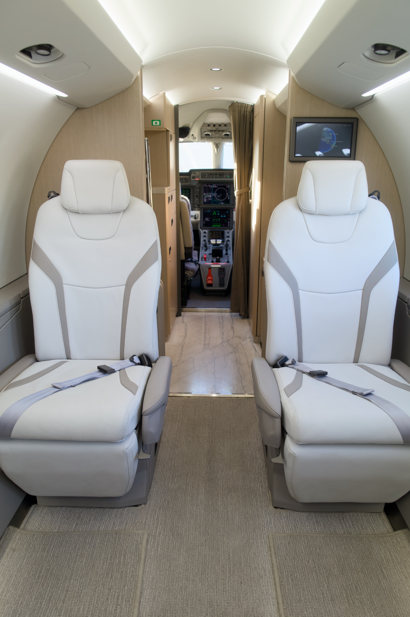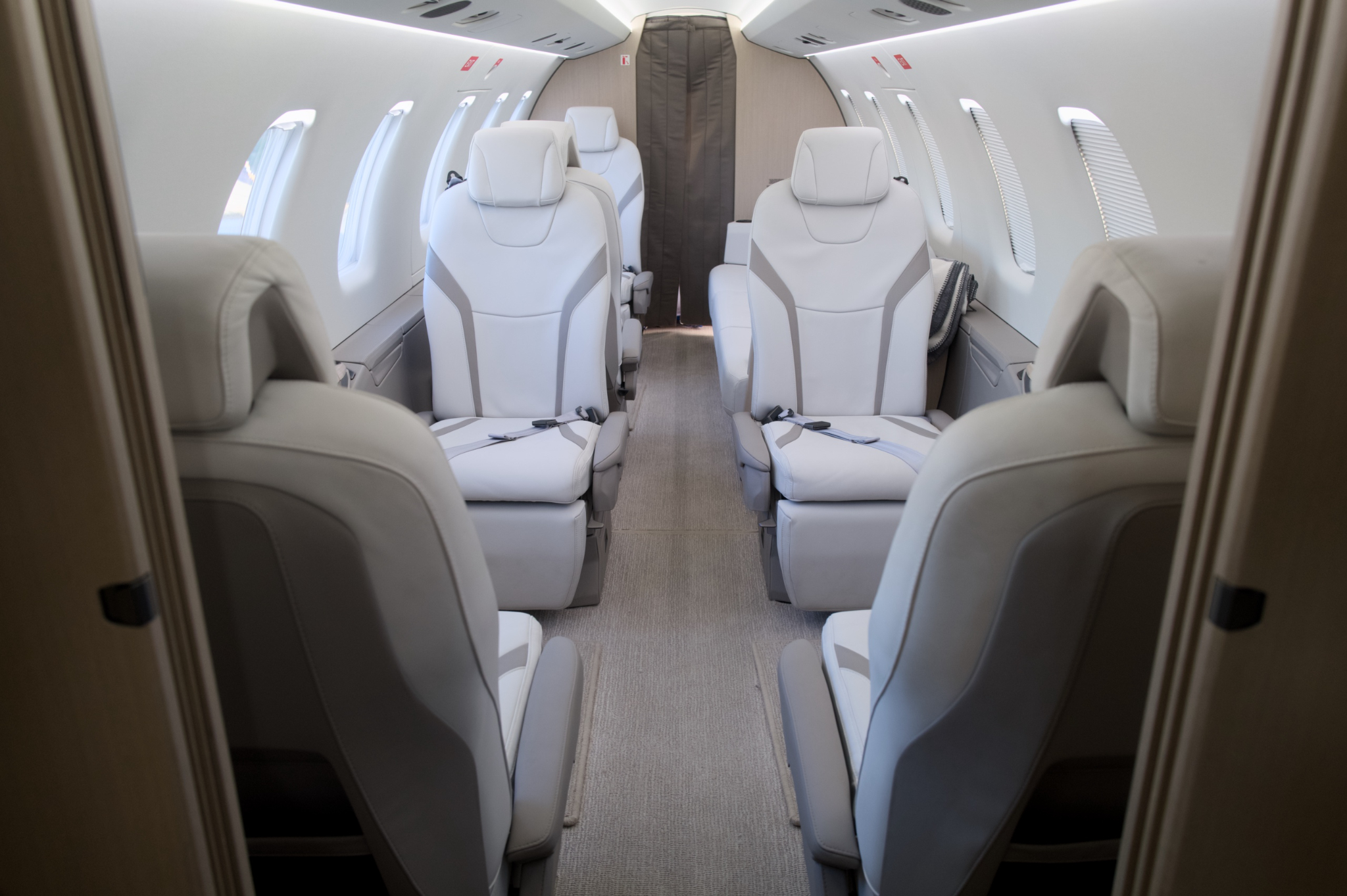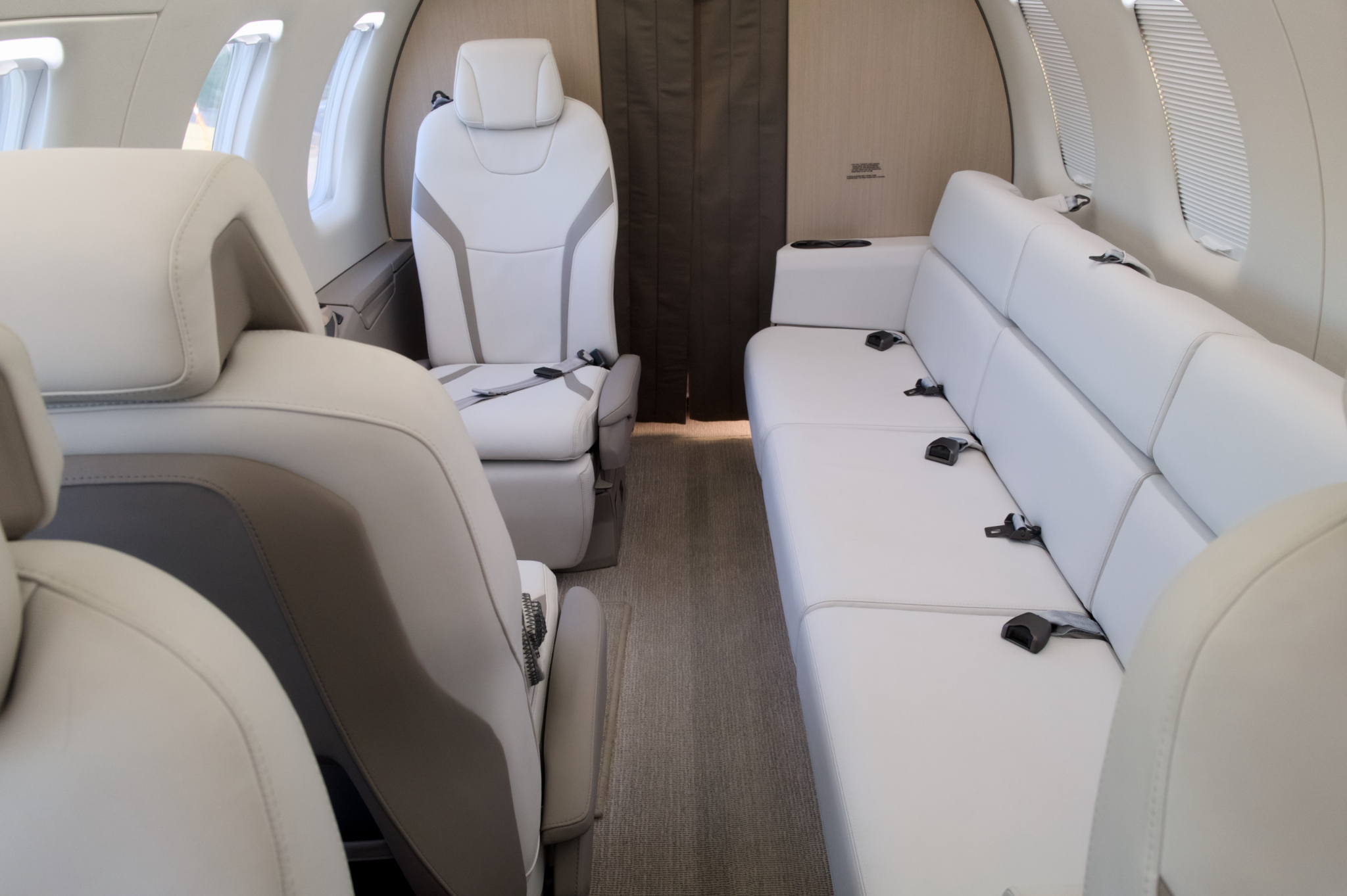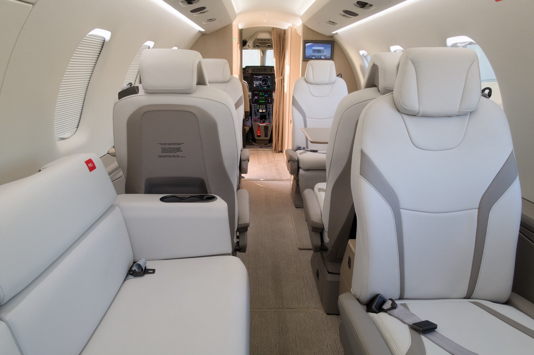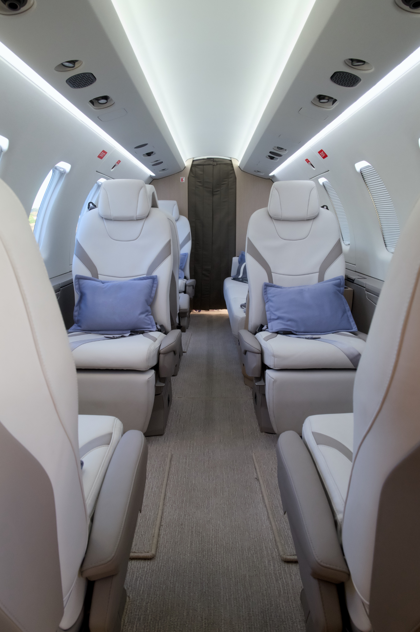 The cabin is arranged to be functional and adaptable, typically with a club seating section and options for additional seats depending on interior and certification. A key differentiator is the large aft cargo door that supports loading bulky items more easily than many light jets, which can reduce compromises on baggage when traveling with equipment. Expect a business-jet environment focused on practical space and mission flexibility rather than a heavy emphasis on ultra-quiet isolation.