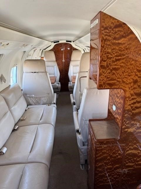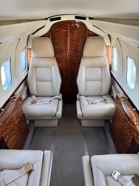 - Beige leather seats, high-gloss wood veneer cabinetry