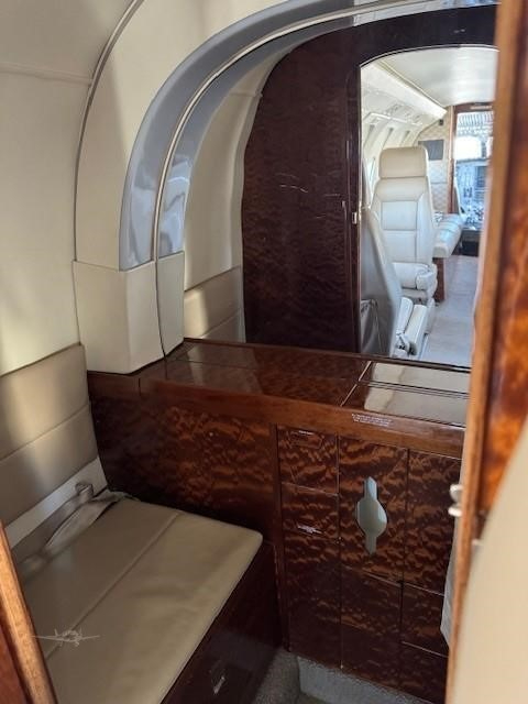 - Nine passenger seating: 3-place forward divan, 4-place club, belted lavatory